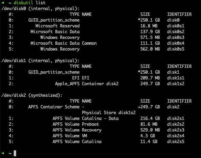 diskutil list제 macOS노트북의 디스크 정보를 다 알려 주고 있네요.
